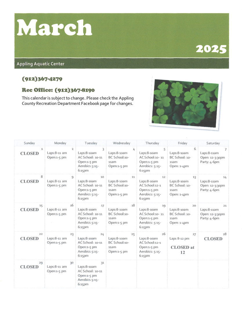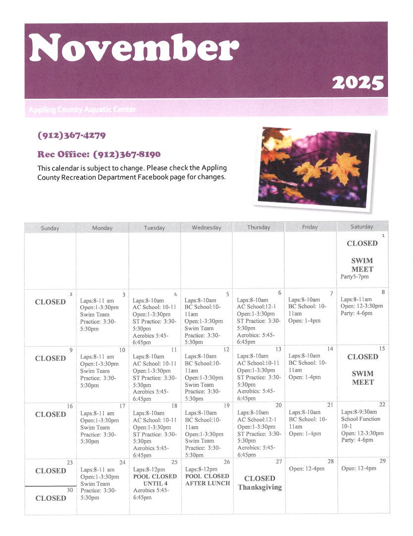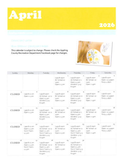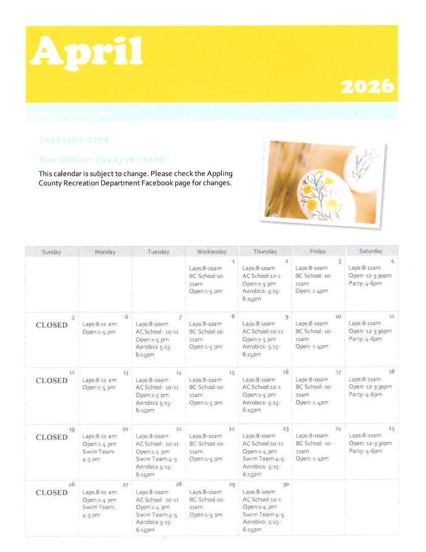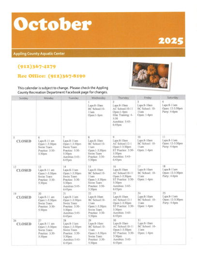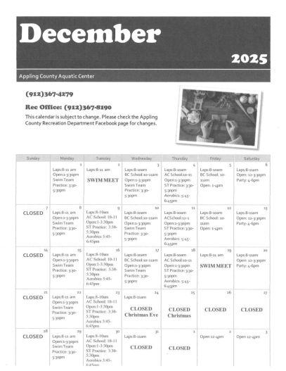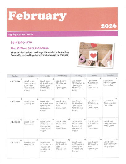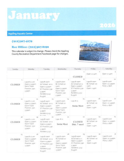 The Appling County Aquatic Center is an eight lane, indoor heated pool. It's open year round and is great for swimming, exercise, competitions, and birthday parties. If you are interested in booking